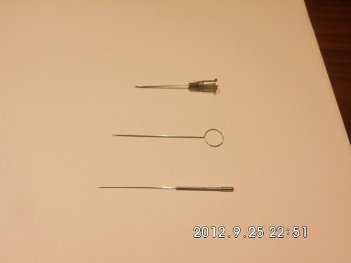 上圖中,最上面為一般埋線針,中間是圓針(小針刀),最下面是針灸的針,從圖中可以看到,埋線針與圓針(小針刀)口徑一般,並沒有特別粗。